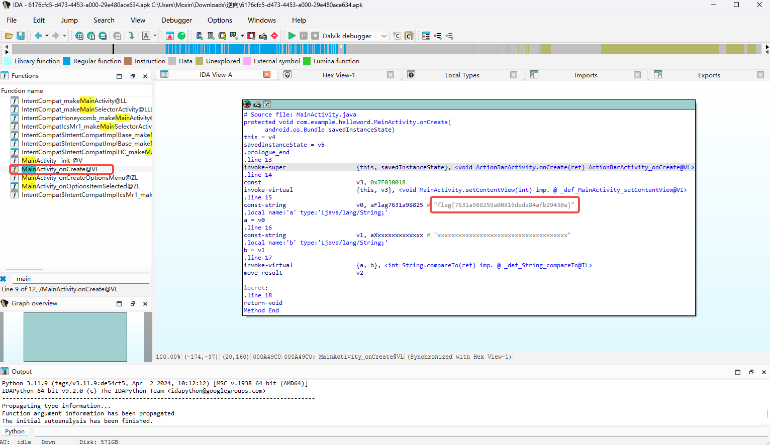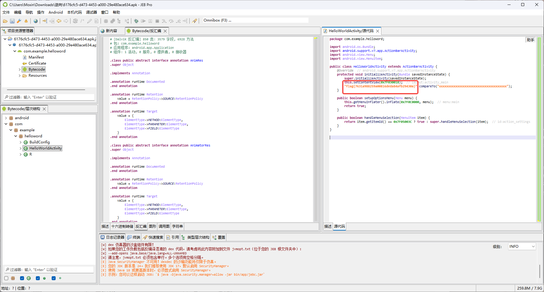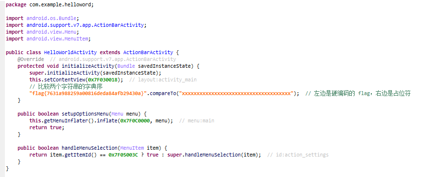 public class HelloWorldActivity extends ActionBarActivity { @Override protected void initializeActivity(Bundle savedInstanceState) { super.initializeActivity(savedInstanceState); this.setContentView(0x7F030018); "flag{7631a988259a00816deda84afb29430a}".compareTo("xxxxxxxxxxxxxxxxxxxxxxxxxxxxxxxxxxxxx"); }