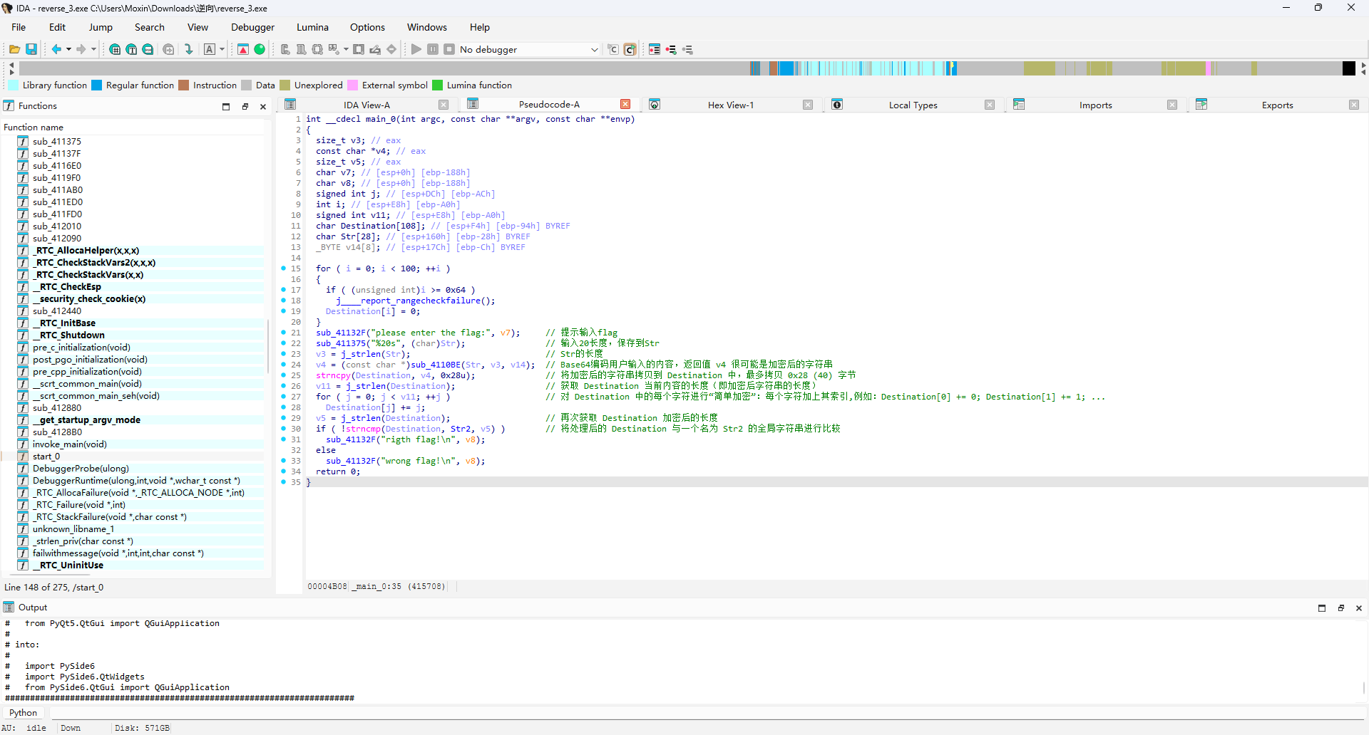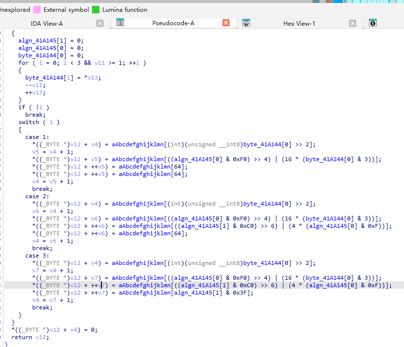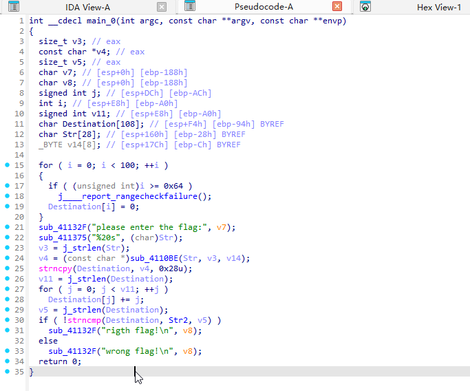 1 2 3 4 5 6 7 8 9 10 11 12 13 14 15 16 17 18 19 20 21 22 23 24 25 26 27 28 29 30 31 32 33 34 35 int __cdecl main_0 (int argc, const char **argv, const char **envp) { size_t v3; const char *v4; size_t v5; char v7; char v8; signed int j; int i; signed int v11; char Destination[108 ]; char Str[28 ]; _BYTE v14[8 ]; for ( i = 0 ; i < 100 ; ++i ) { if ( (unsigned int )i >= 0x64 ) j____report_rangecheckfailure(); Destination[i] = 0 ; } sub_41132F("please enter the flag:" , v7); sub_411375("%20s" , (char )Str); v3 = j_strlen(Str); v4 = (const char *)sub_4110BE(Str, v3, v14); strncpy (Destination, v4, 0x28u ); v11 = j_strlen(Destination); for ( j = 0 ; j < v11; ++j ) Destination[j] += j; v5 = j_strlen(Destination); if ( !strncmp (Destination, Str2, v5) ) sub_41132F("rigth flag!\n" , v8); else sub_41132F("wrong flag!\n" , v8); return 0 ; }