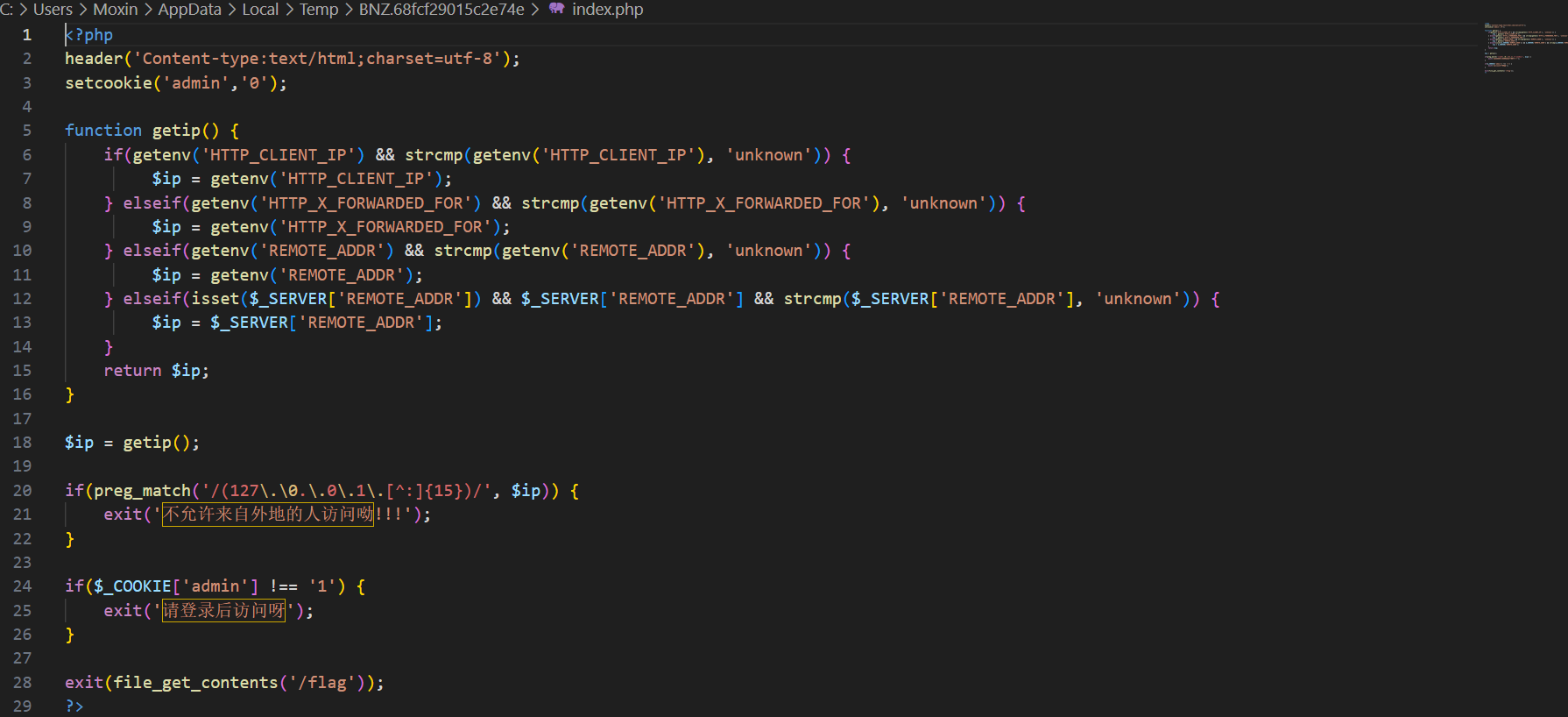 preg_match('/(127\.\0.\.0\.1\.[^:]{15})/', $ip)很怪:模式中有\0(NUL)和[^:]{15}。这看起来像是在搞“null 字符/编码”的考查或是故意混淆。对普通的 IP(例如127.0.0.1、1.2.3.4)通常不会匹配到这个模式,所以大多数真实请求不会被exit('不允许来自外地的人访问呦!!!')阻断。 - 因此,IP 检查在题目中并不能阻止攻击者(除非服务器的