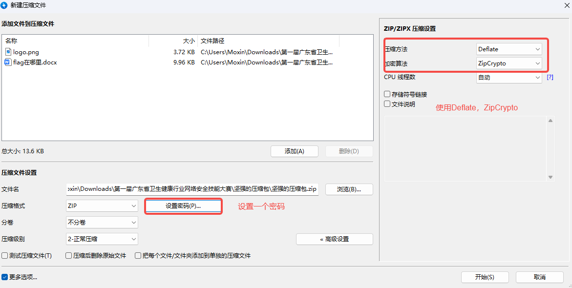 随后将png文件(也就是不是flag的文件),单独用同样的压缩方法、加密算法打包成单独的压缩包。
