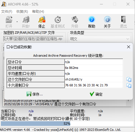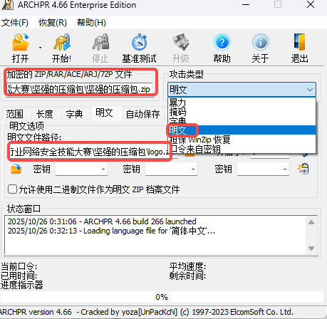 使用ARCHPR工具,选择明文攻击(Plain-text),左上角选择包含密码的压缩包,明文文件选择没有密码的压缩包,点击开始即可。